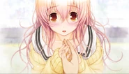 Aoi Mukou is one of the three main protagonists of Kimi to Kanojo to Kanojo no Koi. A classmate of Shinichi and Miyuki’s, her brain is full of nothing but games. Going beyond casual jokes and spouting dated memes like other VN savvy characters, there’s something inherently destructive about the way she has to liken everything in their lives to a VN. Poor at socializing, both Shinichi and Miyuki feel like she’s unable to draw a line between reality and VNs, having them seamlessly merge. She initially starts her life off as a normal human, who is eventually killed by Miyuki Sone in a fit a rage and jealously. She would be brought back many times but her biggest change is in the true ending. In this ending, Aoi loses her physical existence and now exists as a personified idea, being every heroine in Nitroplus's expanded multiverse. Now, Aoi essentially exists in some form across different visual novels and is akin to a bug, a glitch that manifests itself in other game worlds.